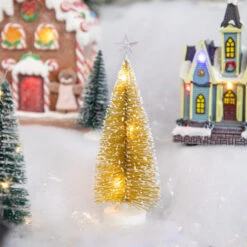 Northlight LED Lighted Mini Bottle Brush Pine Christmas Village Trees – Gold Finish – Set Of 2
