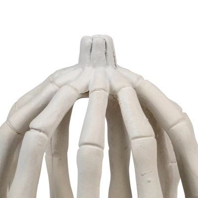 Dark nights and spooky frights fill the Halloween air. Skeleton fingers make up this lighted, creepy illusion, pumpkin. This will make the perfect addition to your tabletop, mantle, shelves, or anywhere you want to add that frightening touch.Product Features:LED skeleton pumpkin decorationFeatures skeleton fingers shaped like a pumpkinAccented with LED lightingOn/Off switch located at the bottomBattery operatedFor indoor use onlyDimensions: 6.25″ high by 4.75″ diameterMaterial(s): polyresin