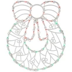 Add a touch of winter wonder to your holiday decor with our LED lighted holiday wreath window silhouette. This enchanting wreath silhouette will transform any window into a festive focal point. The warm, inviting glow of the lights will create a cozy atmosphere, perfect for celebrating the season with friends and family. Product Features:Color: green and red bulbs/white wire Number of bulbs: 50 Bulb size: mini concave wide angle24″ white lead cord Double sided design Fully assembled:suction cup includedAdditional product features: Super bright bulbsCool to the touch LED lights use 90% less energy UL certified and approved for indoor and outdoor useIf one bulb burns out, the rest will stay litComes with replacement bulbs and spare fuseContains 1 plug with end connector which allows you to stack multiple lighted items together (not to exceed 210 watts)Wire gauge: 22120 volts, 60 hertz, .15 amps, 1.5 wattsDimensions: 16″H x 13″W x 0.75″DMaterial(s): plastic bulbs/wire