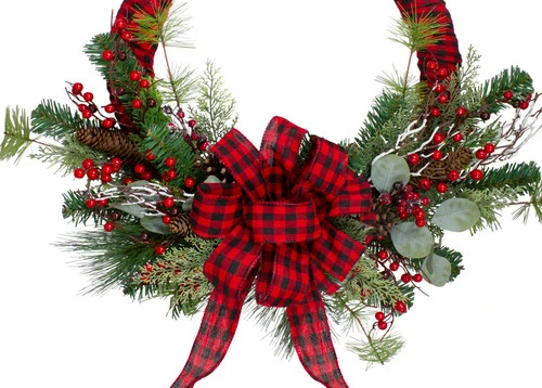 Wrapped in red and black buffalo plaid ribbon with a matching bow